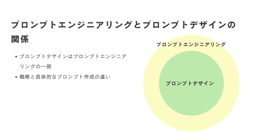 つまり、プロンプトエンジニアリングが全体的な戦略と技術を扱うのに対して、プロンプトデザインはその中の具体的なプロンプトの作成に焦点を当てているのです。