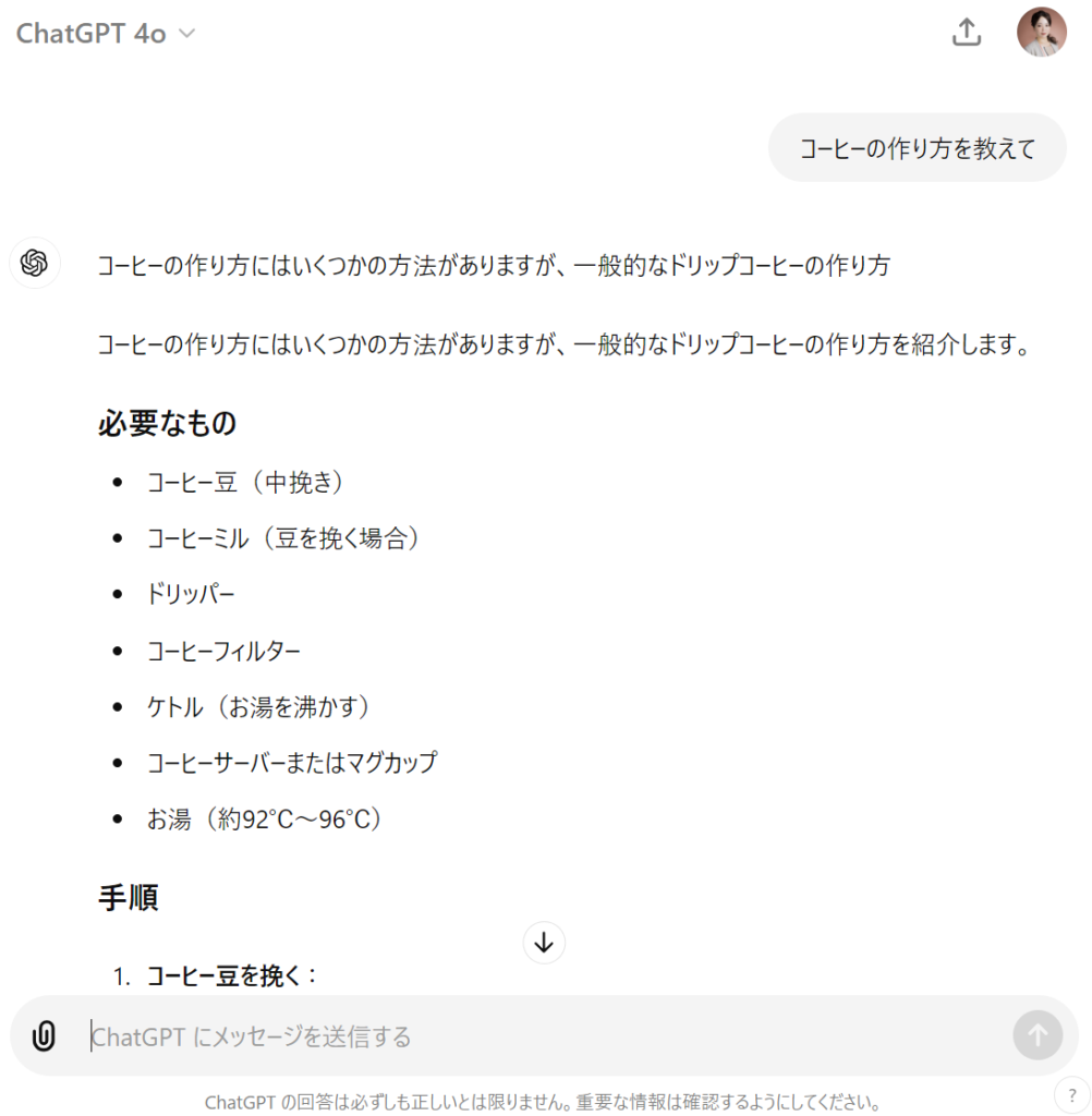 まずは、ChatGPTに慣れるためにも、どんどん質問を投げかけてみましょう。雑な質問でも構いません。例えば、「今日の天気は?」とか「コーヒーの作り方を教えて」といったシンプルな質問から始めるといいでしょう。