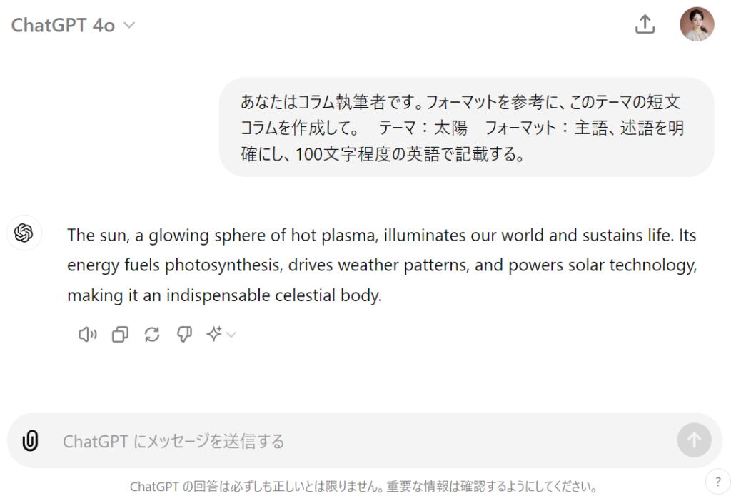 例えば、仕事でデザインの依頼をする場合を考えてみましょう。いきなり「このWebサイトをいい感じにデザインして!」と曖昧な依頼をするよりも、「デザインシステムはこれを使って、参考にするWebサイトはこれです」と具体的な依頼をした方が、期待通りの仕上がりになりますよね。これと同じように、ChatGPTに対しても具体的な例を示すことで、より正確な回答を引き出すことができるのです。