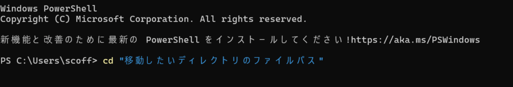 コマンドプロンプト又はターミナルを開いて、まずは、作業中のディレクトリに移動します。