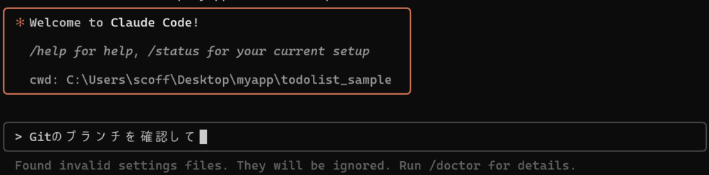試しに、「Gitのブランチを確認して」と質問してみました。