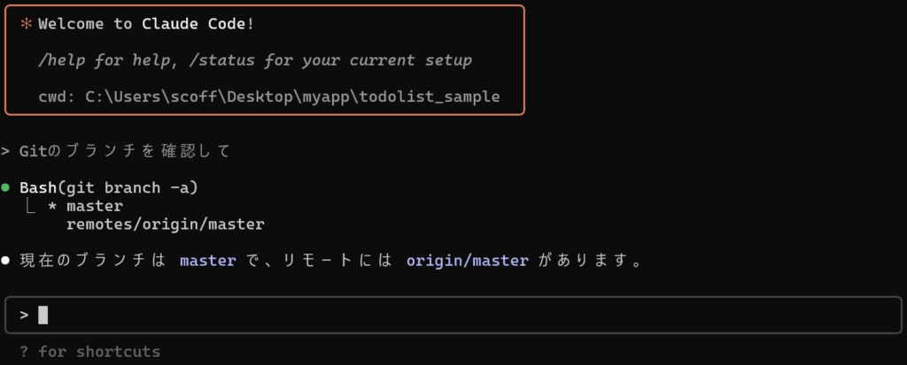 GithubCLIのインストールが完了したら、後はClaudeCodeを起動して、自然言語での指示がGitHub操作に直接変換されます。