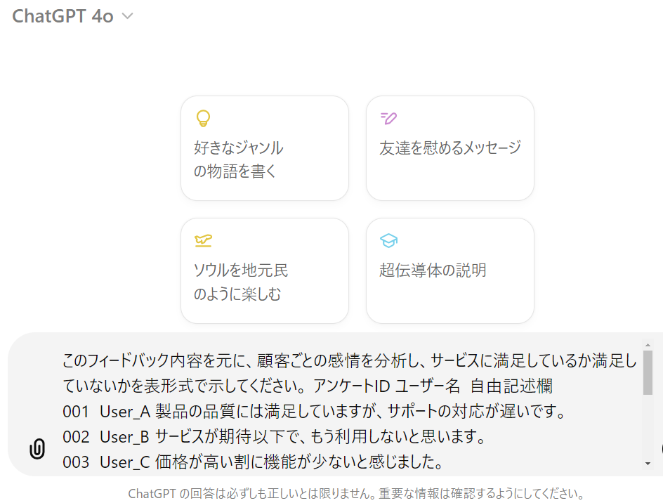 このプロンプトを入力することで、ChatGPTはフィードバックの内容を分析し、各顧客がどのような感情を抱いているかを判断したうえで、その結果を満足しているかどうかで分類し、表形式で出力します。これにより、フィードバックの内容を視覚的に把握することができ、どの分野に改善の余地があるのかを迅速に見極めることができます。
