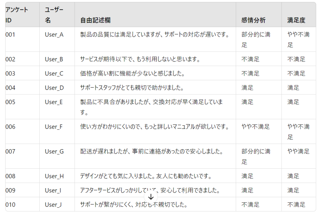「このフィードバック内容を元に、顧客ごとの感情を分析し、サービスに満足しているか満足していないかを表形式で示してください。」