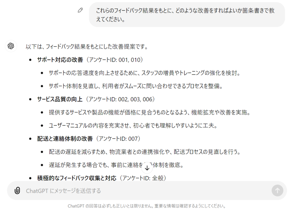 このプロンプトを入力すると、ChatGPTはフィードバックの内容を分析し、具体的な改善提案を箇条書きで示してくれます。例えば、UI/UXの改善、設定の自由度の変更、エラーの改修、カスタマーサポートの質の向上などが挙げられるでしょう。