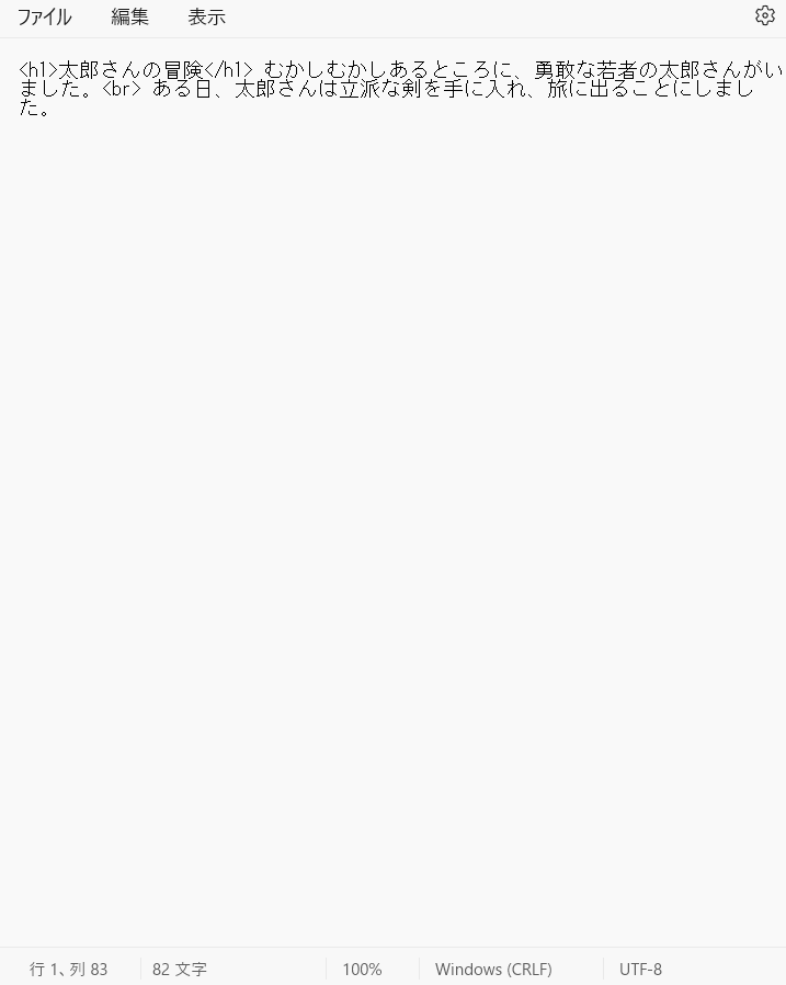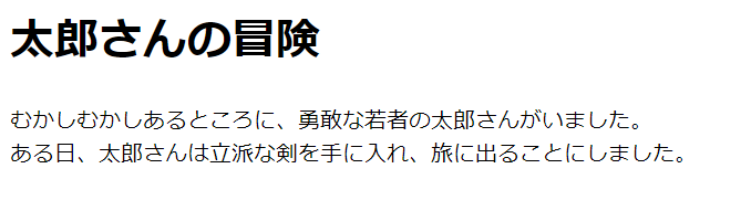 <h1>太郎さんの冒険</h1> むかしむかしあるところに、勇敢な若者の太郎さんがいました。<br> ある日、太郎さんは立派な剣を手に入れ、旅に出ることにしました。